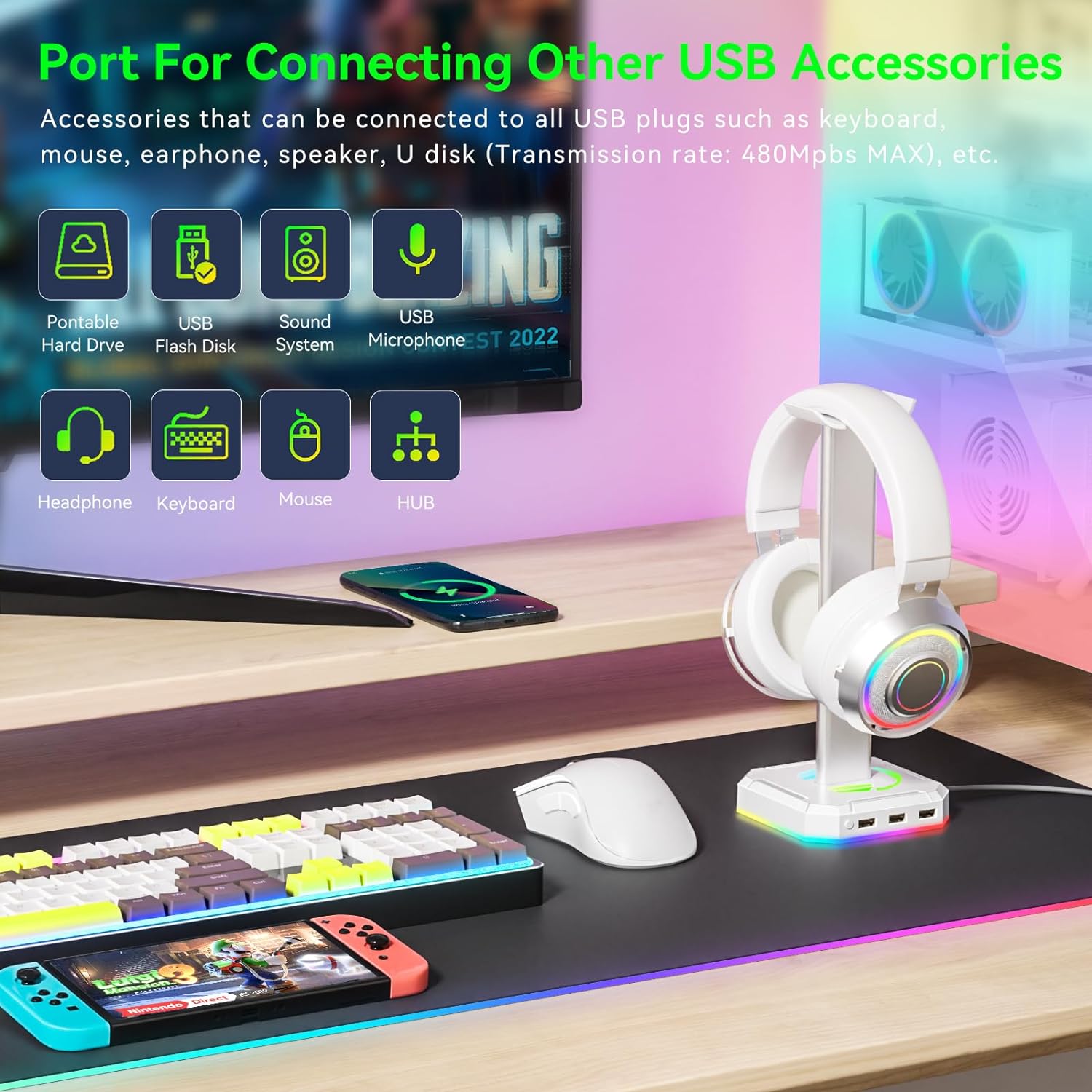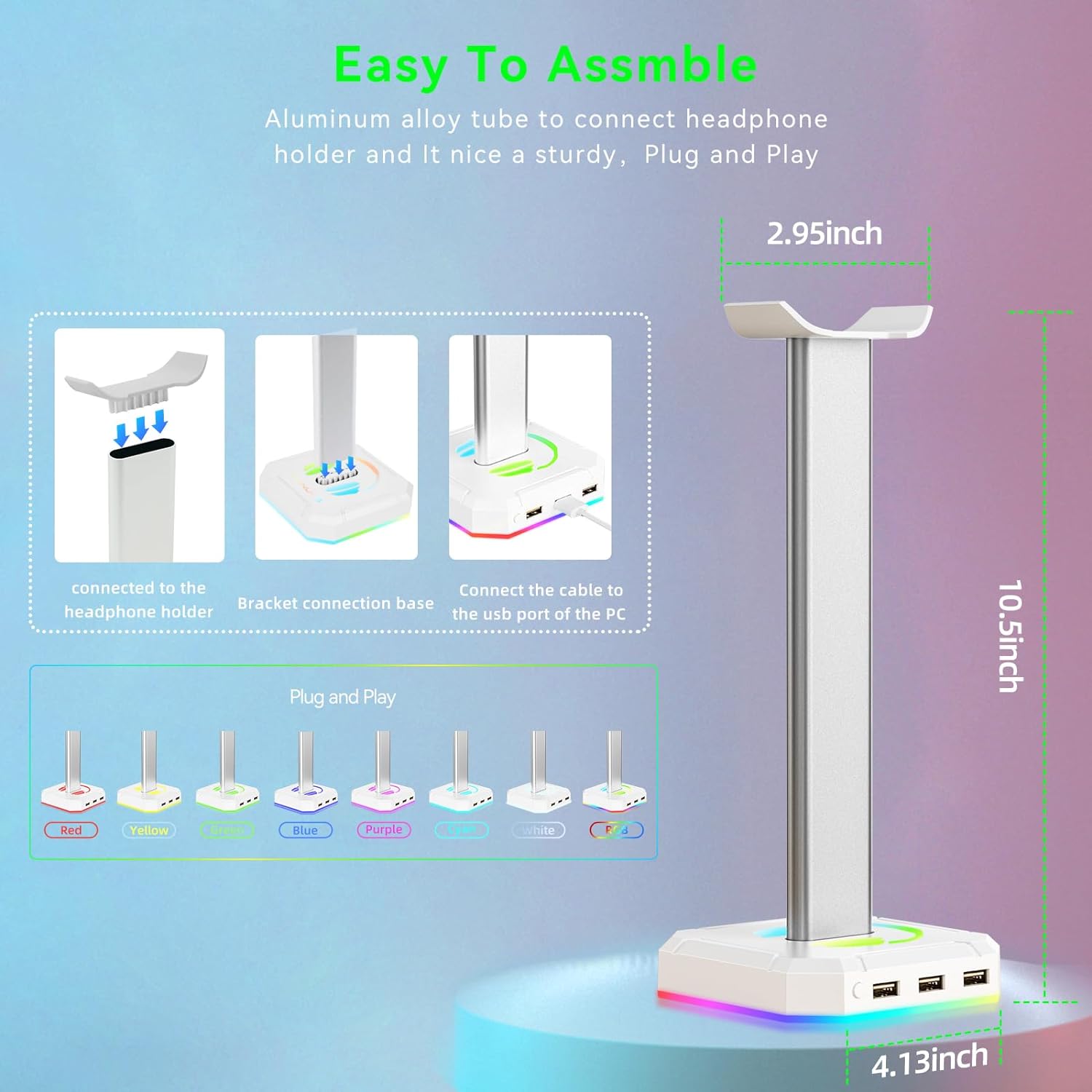 Product Description: Experience exceptional convenience and add a modern touch to your workspace with our innovative White Headphone Stand for Desk with RGB Lights. This multifunctional headset holder has been expertly designed not only to showcase your headphones but also to declutter your desk while adding a unique sense of style. Finished in a sleek white that can seamlessly blend with any interior, the stand can hold virtually any over-ear headphone. The standout feature of this product is the radiant RGB lights that provide a cool, colorful aesthetic, turning your regular desk into a futuristic gaming station or a hip home office. With a simple touch, you can switch between different light effects to match the mood or your setup’s color scheme. Adding to its versatility, the headphone stand comes equipped with 3 USB ports. You can use these ports to connect an array of devices like keyboard, mouse, headset, or even for charging your smartphone. Experience swift data transmission and efficient charging thanks to the stand’s advanced technology. The solid, stable base ensures your headphones stay securely in place and don’t tip over, preventing scratches and other damage. Furthermore, the stand’s compact size doesn’t encroach too much of your desk space while keeping your headphones within arm’s reach. This White Headphone Stand for Desk with RGB Lights offers a simple yet effective solution to keep your headphones safe, your desk organized, and your workspace lit. This is an absolute must-have for gamers, music aficionados, office workers, and students. Grab one now and enhance your desk setup! Please note: Headphones are not included.